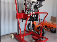 钻机为两立柱立式结构钻孔方向垂直向下,由汽油发动机、变速箱、主轴、钻头、立柱、底座升降结构、冷却给水泵、行走机构等主成。